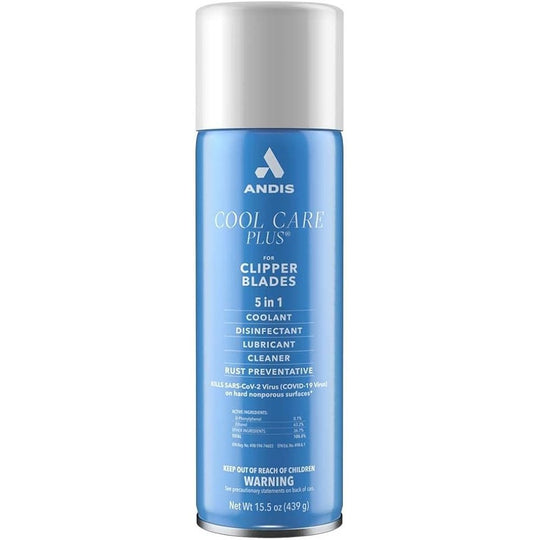 Keep grooming healthy, safe and clean with Andis Cool Care Plus for Clipper Blades! Made in the USA, this five-in-one formula is a blade coolant, disinfectant, lubricant, cleaner and rust preventive, making it easy to care for detachable blades. It’s also a virucide, fungicide, bactericide and tuberculocide. Featuring a high-pressure, comfort-tip nozzle, it sprays hair out of the blade teeth without having to remove the blade for maximum efficiency. The specially designed, sculpted aerosol can with an easy grip decreases hand fatigue, while reducing friction on the blade, making clipping smoother.