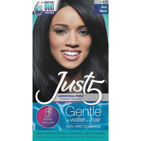 The Just 5 Ammonia-Free Permanent Haircolour in the Shade Rich Black gives you the perfect streak-free black hair with 100% grey coverage in just one easy 5-minute application. ...